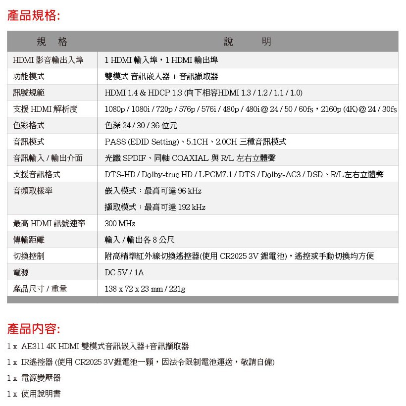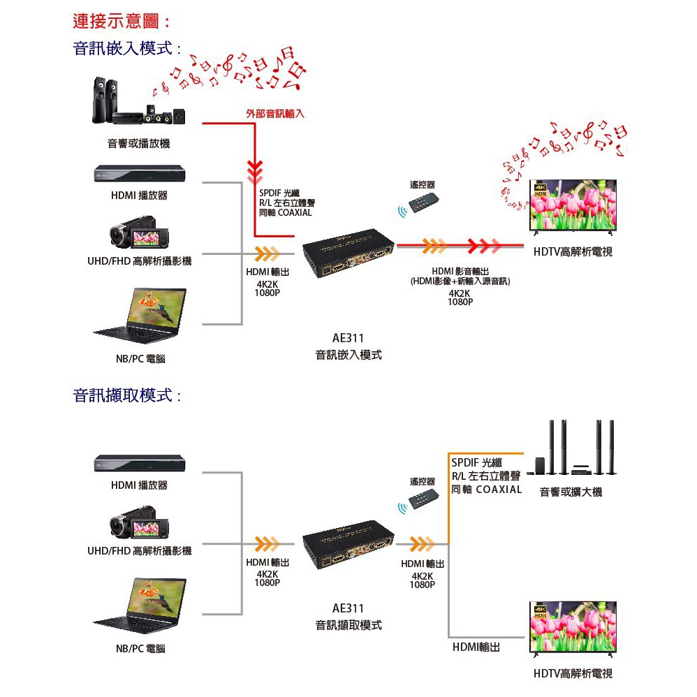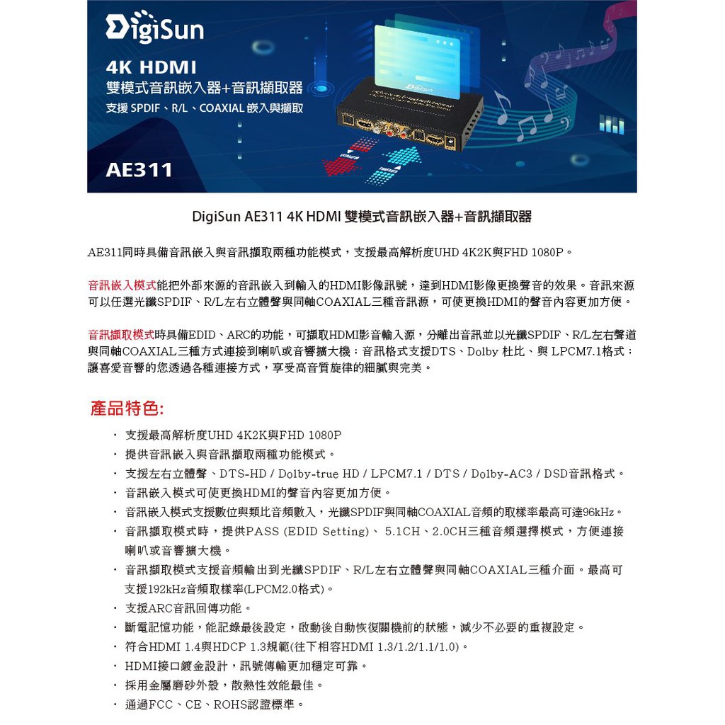 DigiSun AE311 4K HDMI 雙模式音訊嵌入器+音訊擷取器