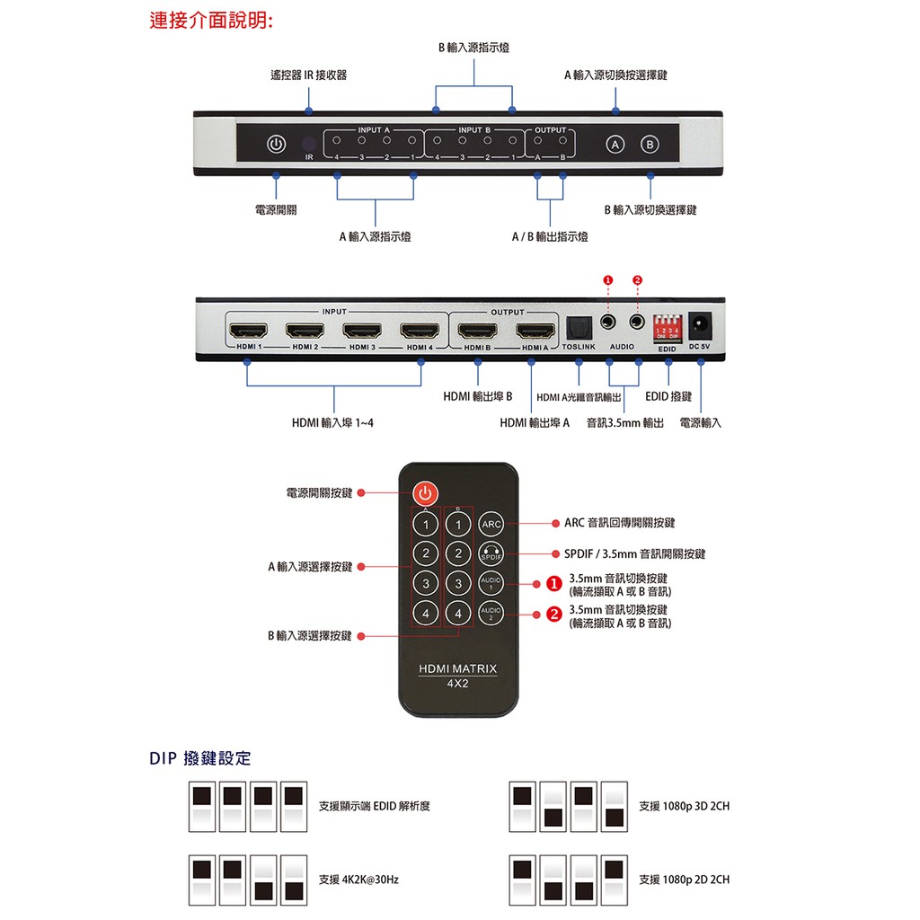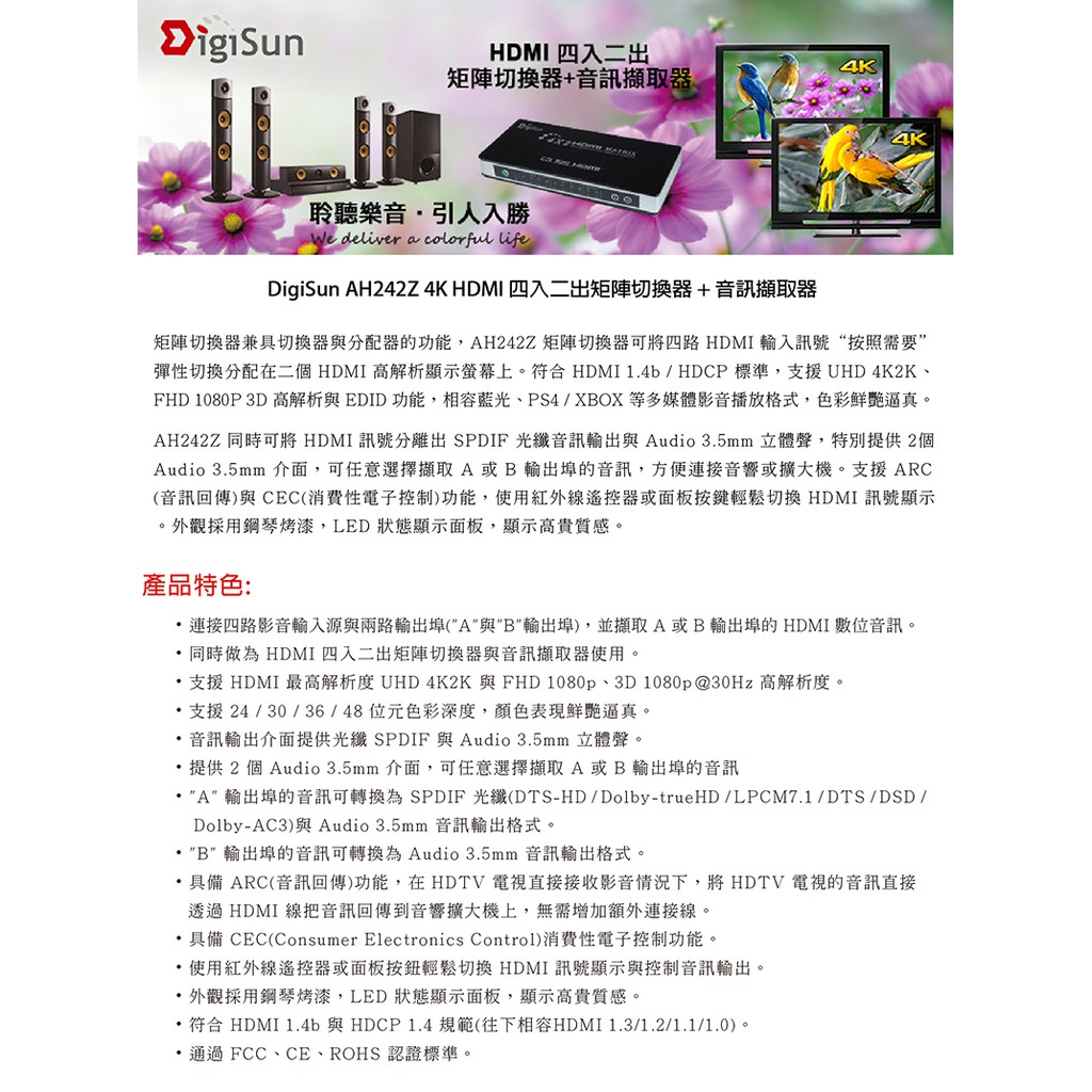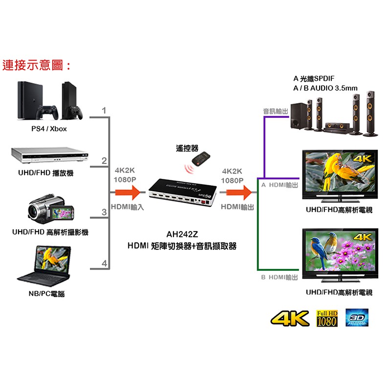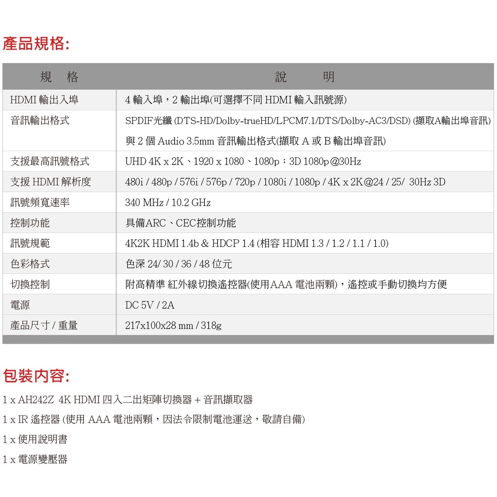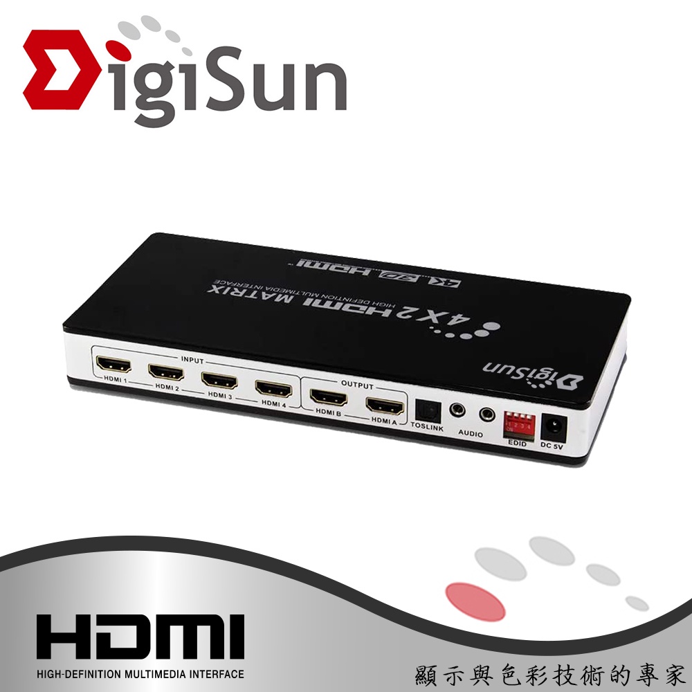 DigiSun AH242Z 4K HDMI四入二出矩陣切換器+音訊擷取器