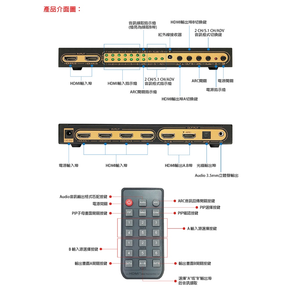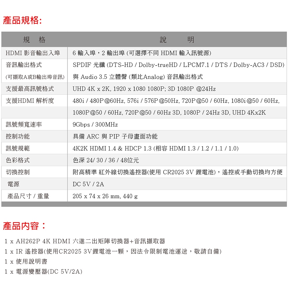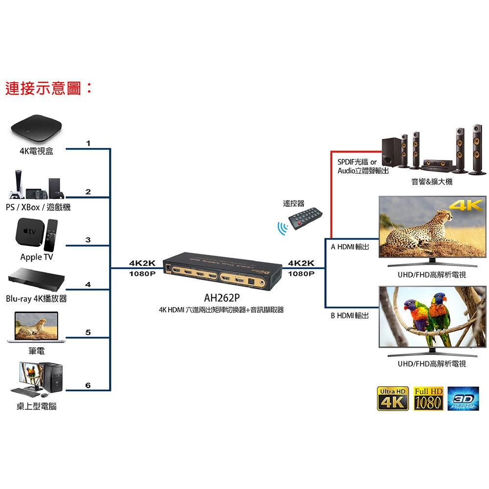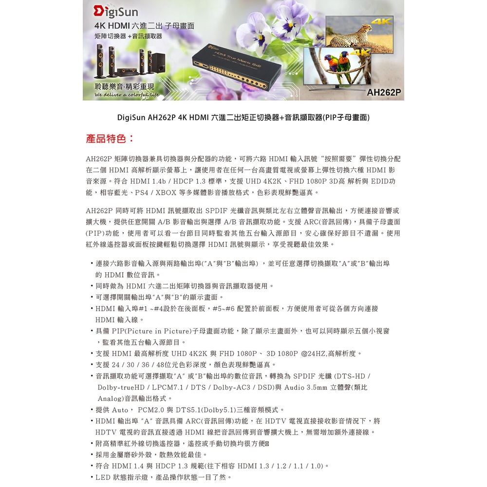 DigiSun AH262P 4K HDMI 六進二出矩陣切換器+音訊擷取器(PIP子母畫面)