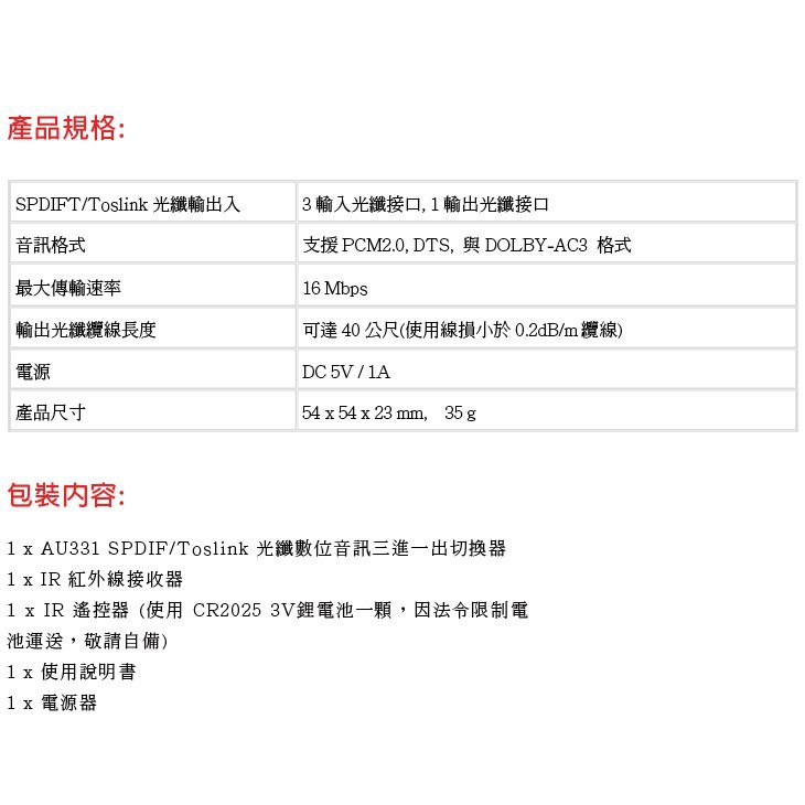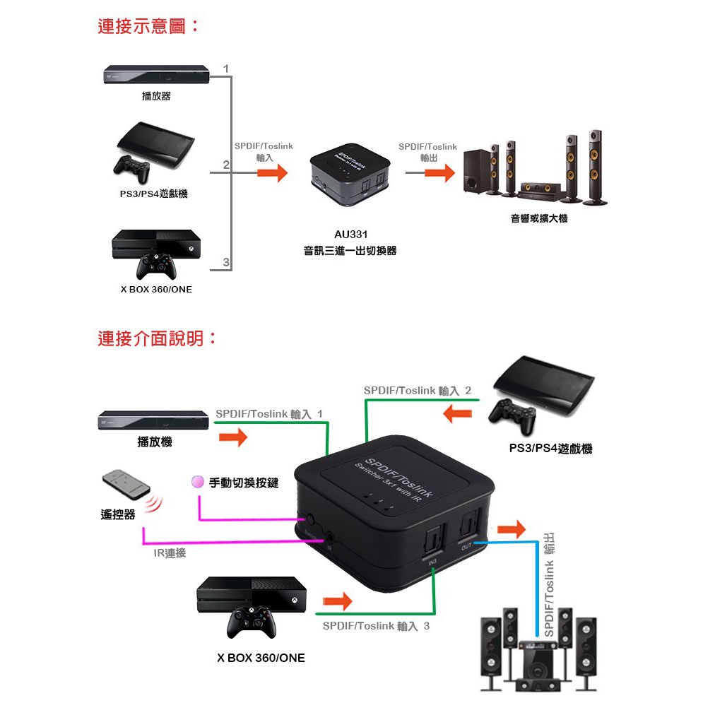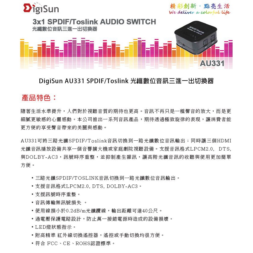 DigiSun AU331 SPDIF/Toslink 光纖數位音訊三進一出切換器
