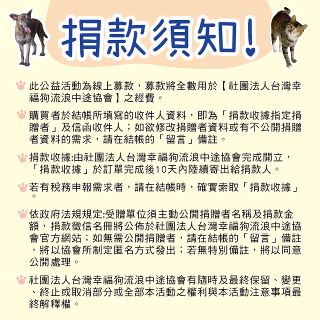 < 純捐款響應 > 我要捐款支持 【社團法人台灣幸福狗流浪中途協會】 園內貓 狗飼料 生活照顧費 線上捐款 捐款 抵稅