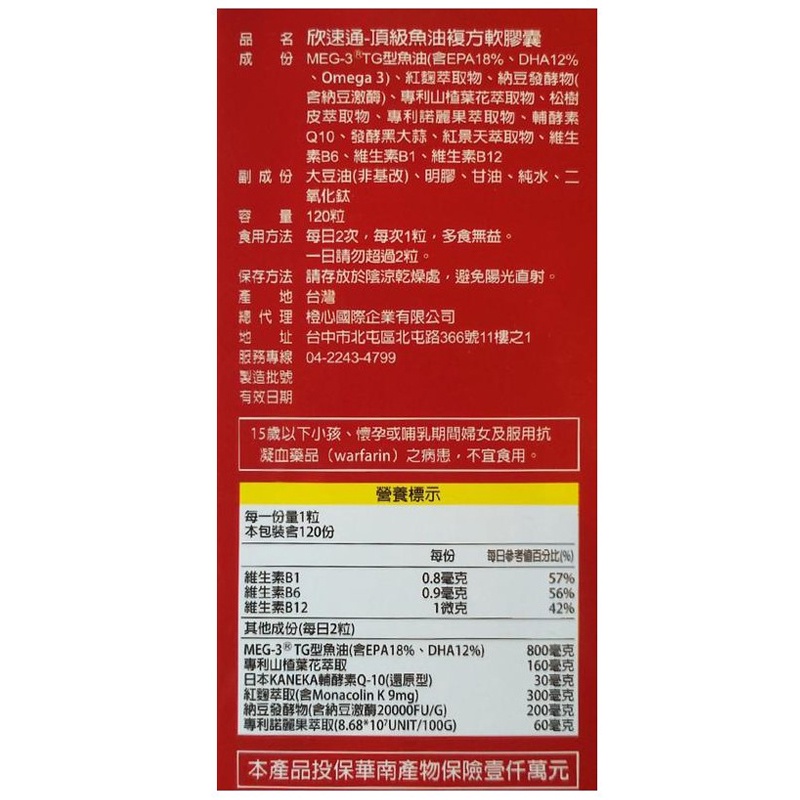 橙心 欣速通 頂級魚油納豆紅麴複方軟膠囊(120粒+30粒) 買大盒送小盒 原廠公司貨 唯康藥局