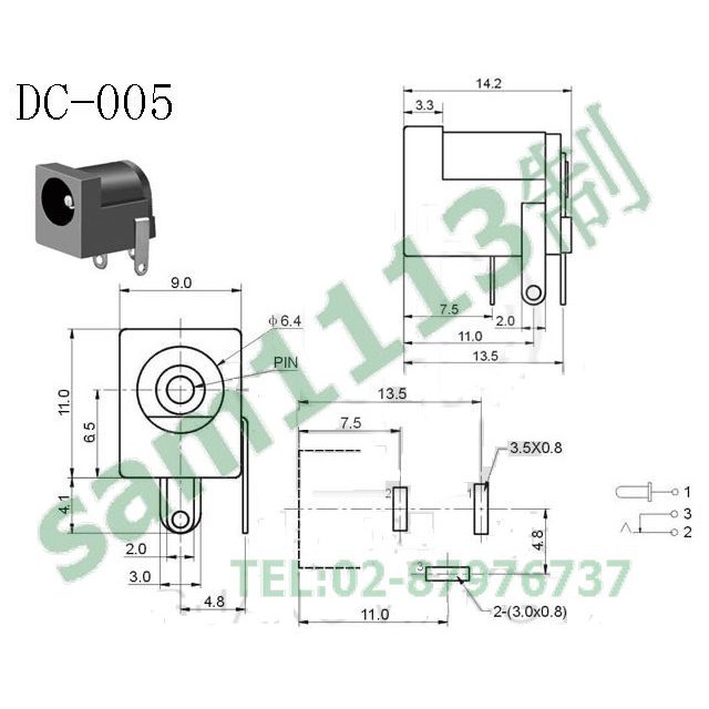 113接頭 電源DC母座 DC JACK 9x11mm 銅質 DC插版插座 3針 90度 5.5x2.1mm >>20個