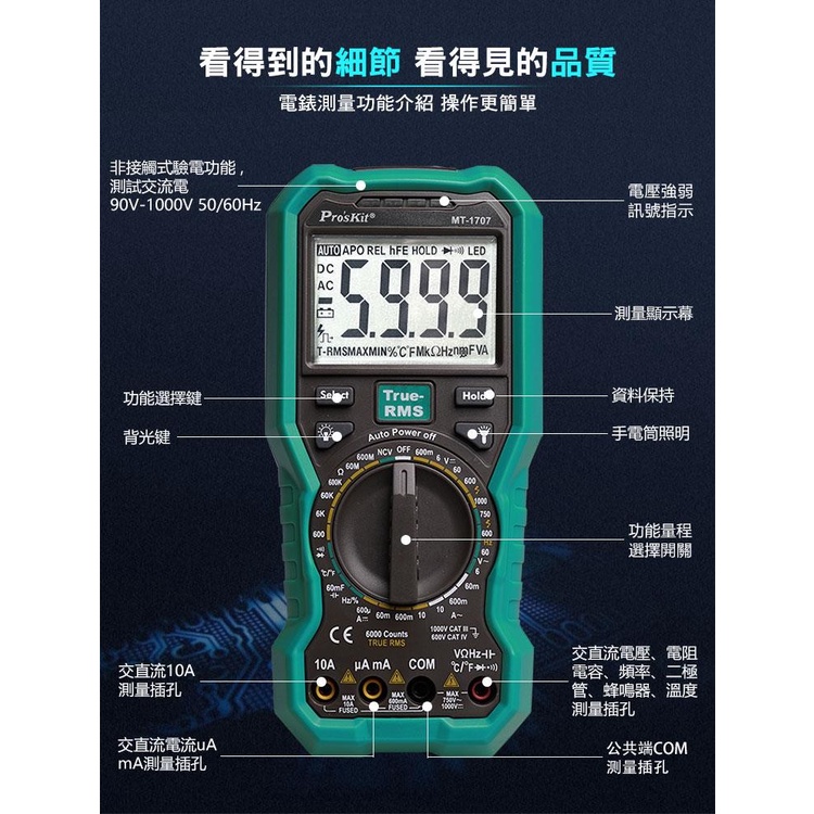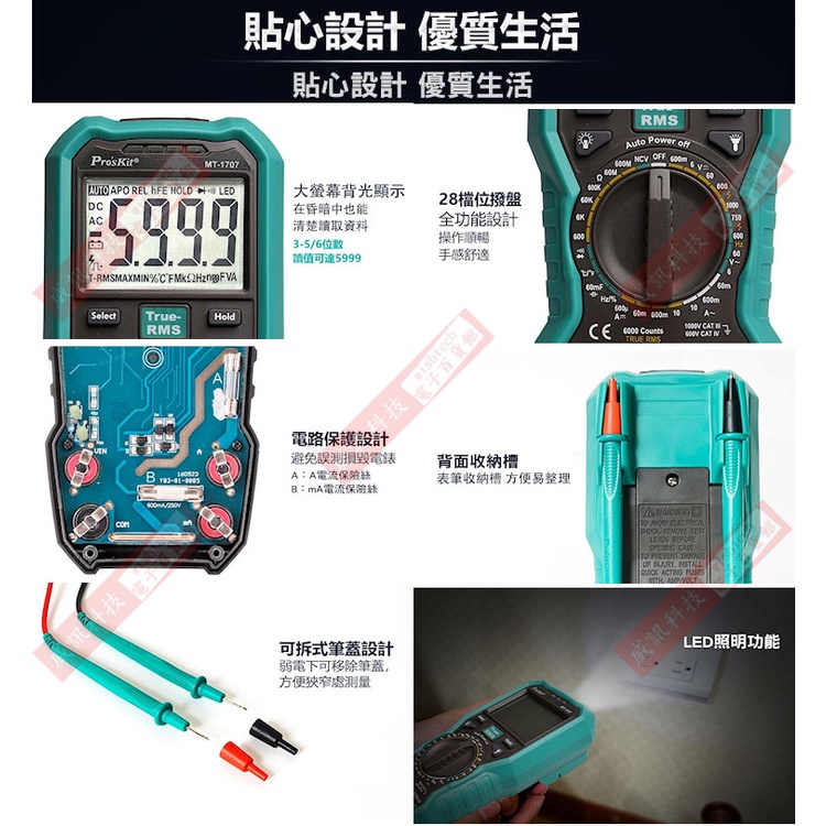 威訊科技電子百貨 MT-1707 寶工 Pro'sKit 3-5/6真有效值數字電錶(不附電池)