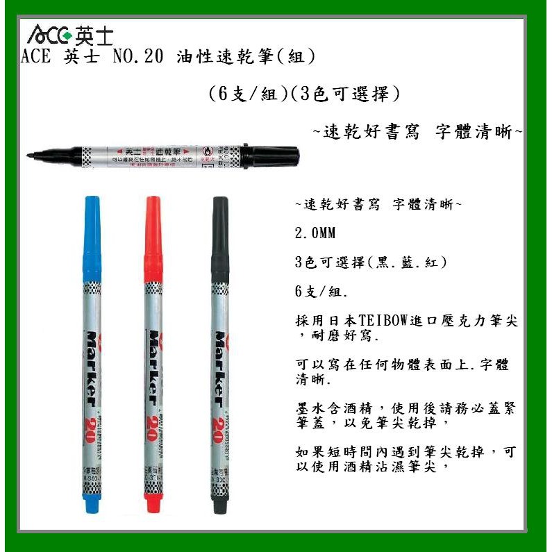 ACE 英士 NO.20 油性速乾筆(組)(3支/組)(3色可選擇)~速乾好書寫 字體清晰~