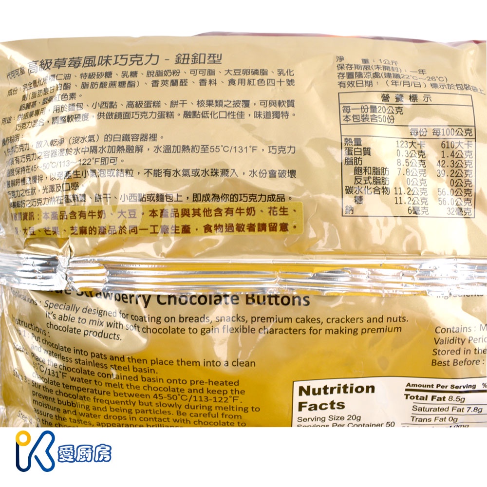 K愛廚房~台灣 H&C正慧 正香軒 代可可脂 鈕扣型巧克力 1kg 鈕釦 白巧克力 牛奶 苦甜 檸檬 草莓巧克力