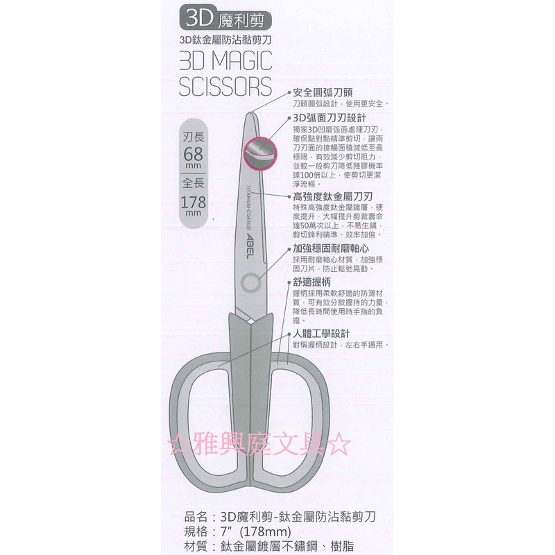 ABEL力大牌 NO.60057 鈦金屬防沾黏剪刀 3D魔利剪 178m (7") / 支