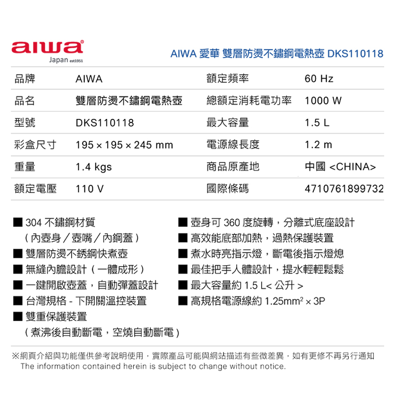 AIWA 愛華 雙層防燙電熱壺 DKS110118 電熱壺 熱水壺 快煮壺 304不鏽鋼快煮壼 快煮水壼 電茶壼