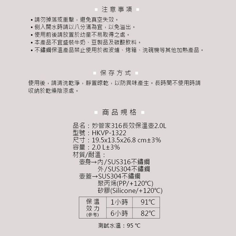 妙管家 #316不鏽鋼長效保溫壺 2.0L 保溫瓶 熱水保溫壺 熱水壺 保冷壺 HKVP-1322