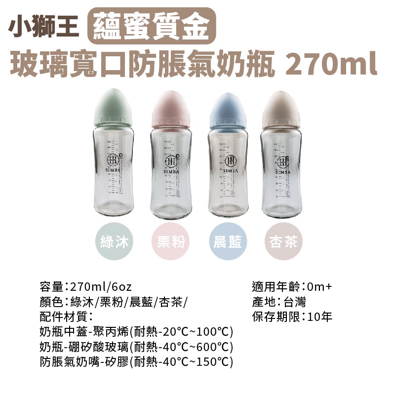 Simba小獅王辛巴 蘊蜜質金玻璃寬口防脹氣奶瓶270ml 圓孔S奶嘴 新生專用 奶瓶 寬口奶瓶 嬰兒奶瓶 防脹氣奶瓶