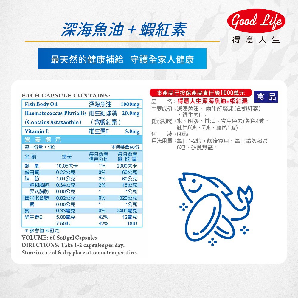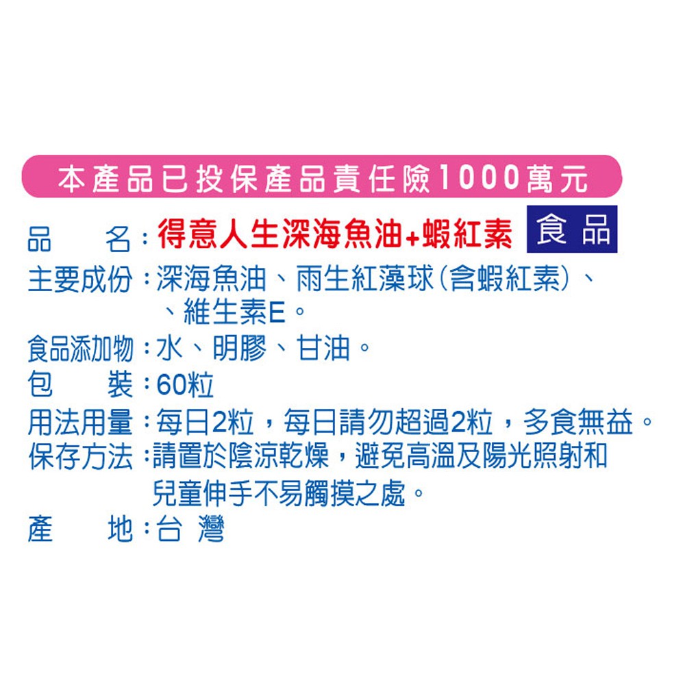 【得意人生】深海魚油+蝦紅素 (60粒) 魚油/蝦紅素/維他命E