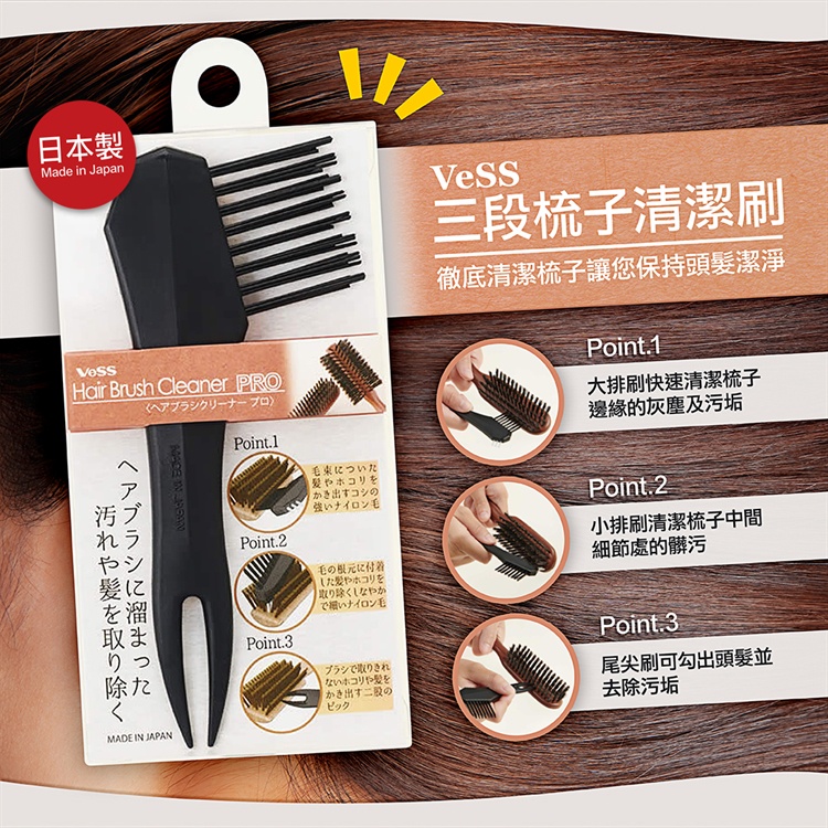 <現貨> 日本製 VeSS 三段梳子清潔刷 髮梳清潔刷 多功能 三段梳子清潔刷 梳子清潔刷 除垢刷 梳子