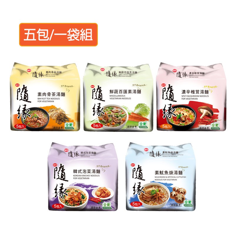 【蝦皮直營】味丹 隨緣 鮮蔬百匯/素肉骨茶/素魷魚羹麵/韓式泡菜/麻辣燙湯麵 (5包/袋) 素食 全素 泡麵