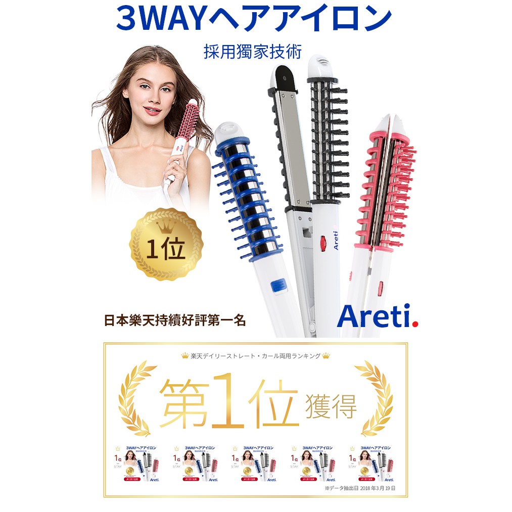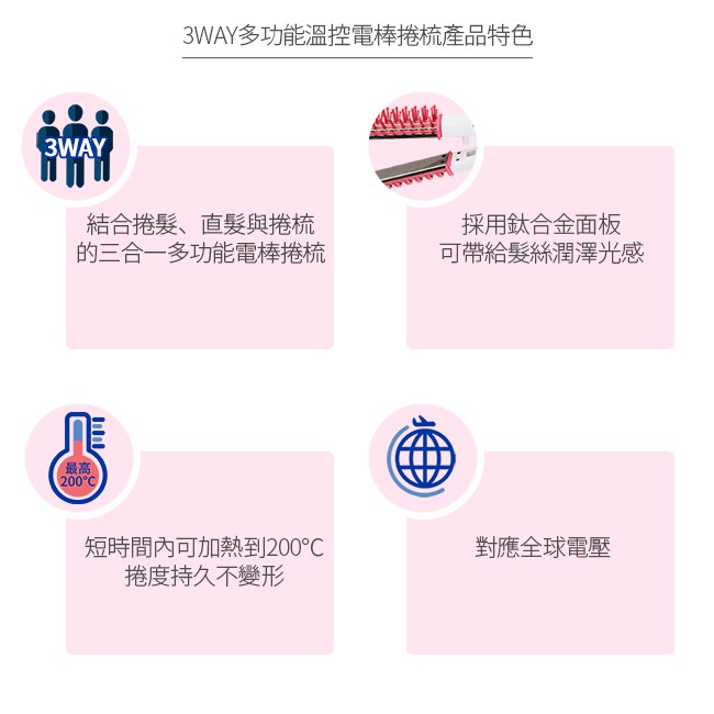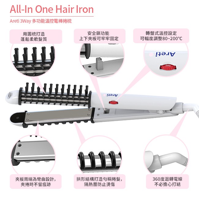 Areti 3way多功能溫控電棒捲梳(黑/粉)