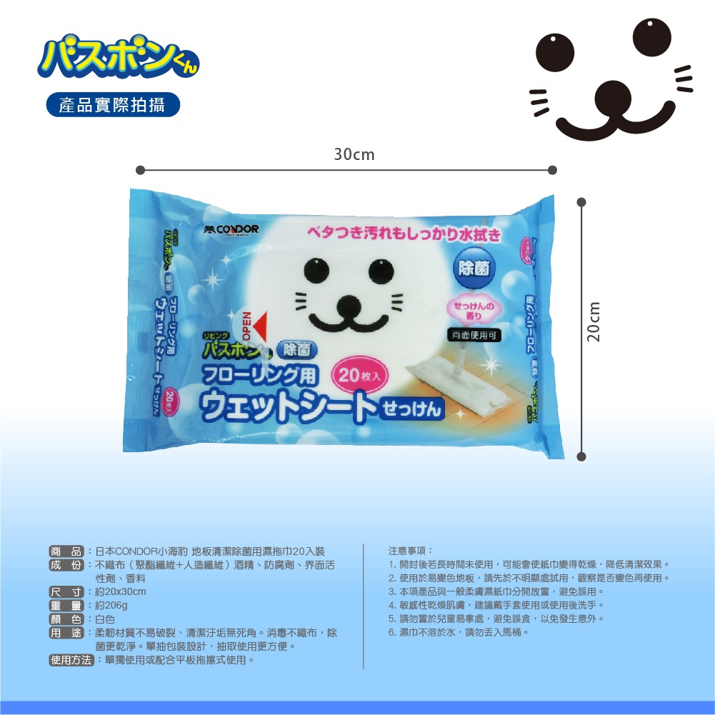 【日本山崎】小海豹地板清潔抗菌用濕拖巾 20抽/地板紙巾 濕拖巾 除塵濕紙巾