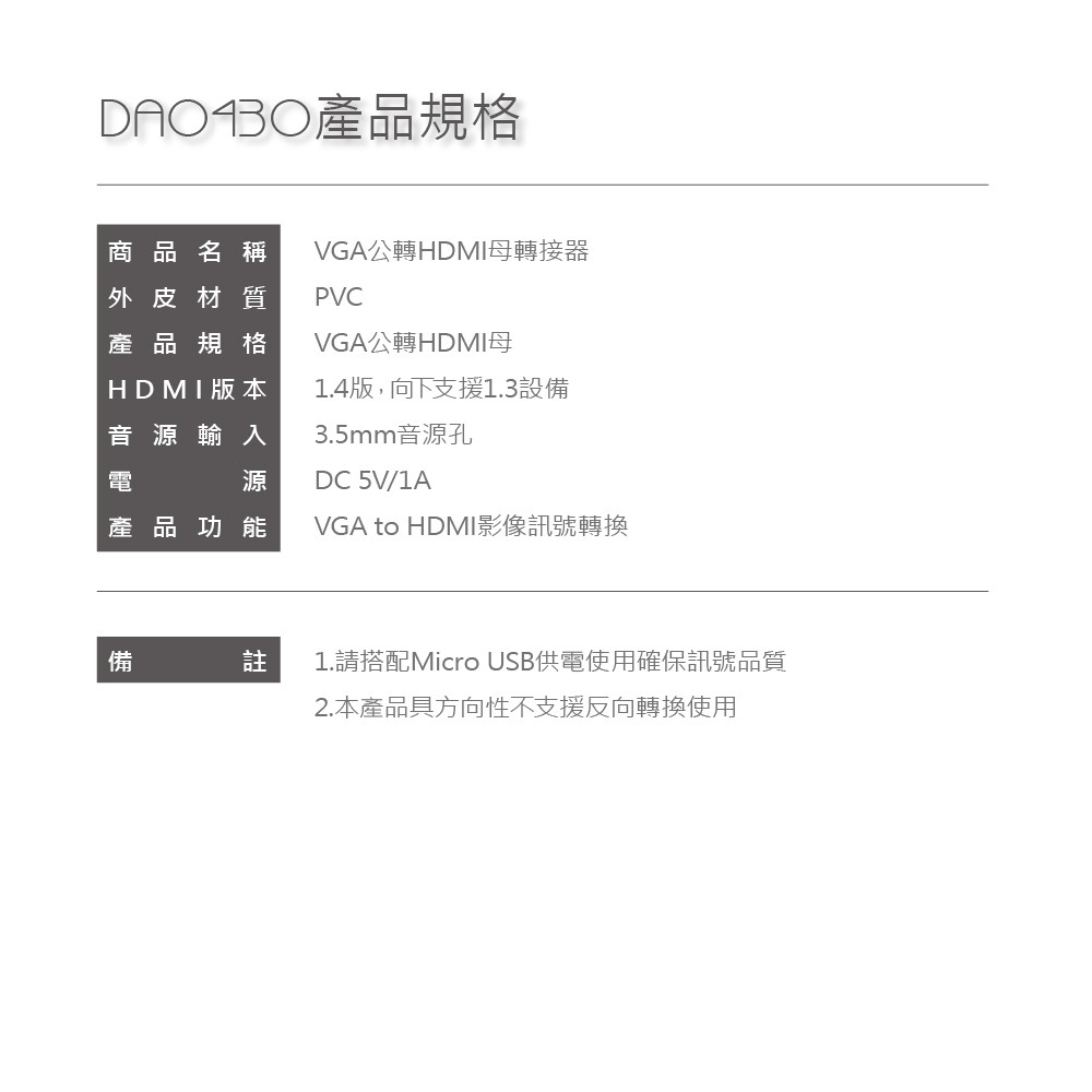 DIKE 轉接器 VGA公轉HDMI母 VAG轉HDMI 公對母 DAO430
