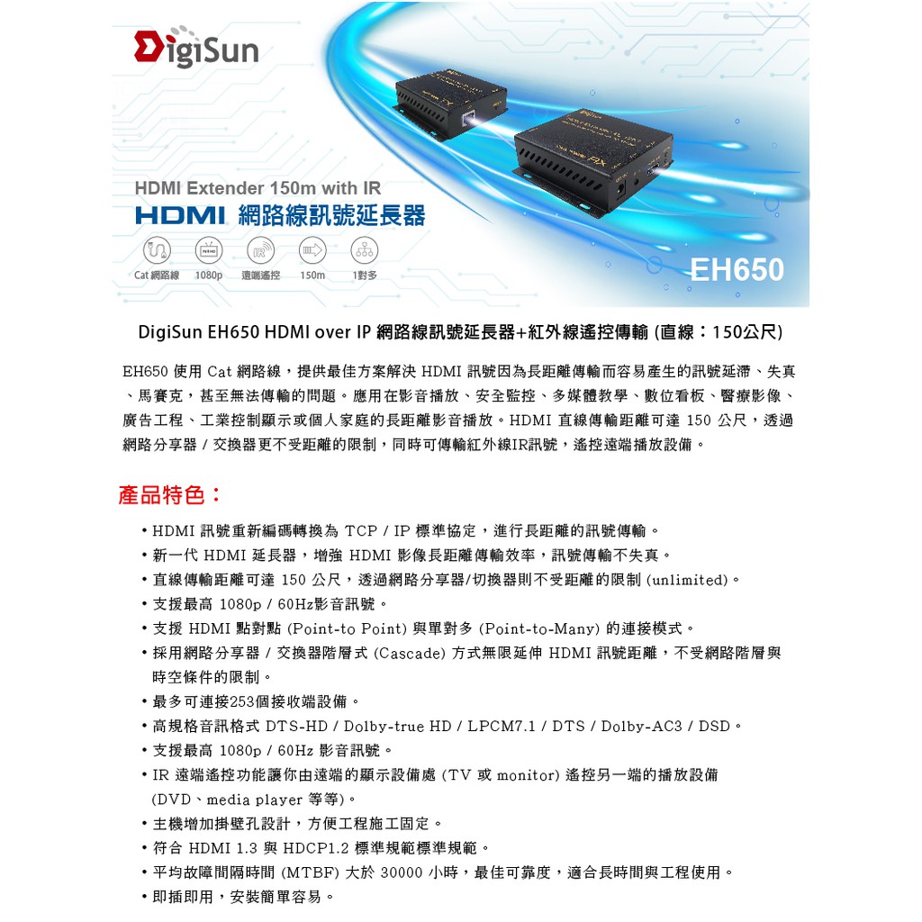 DigiSun EH650 HDMI over IP 網路線訊號延長器+紅外線遙控傳輸 (直線150公尺)