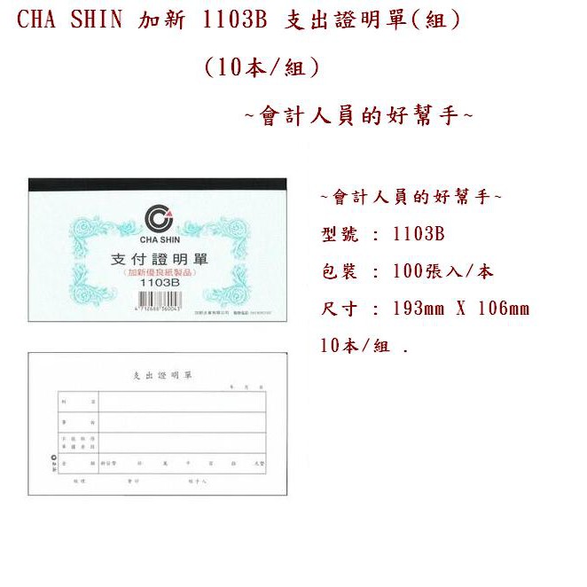 CHA SHIN 加新 1103B 支出證明單(組)(10本/組)~會計人員的好幫手~