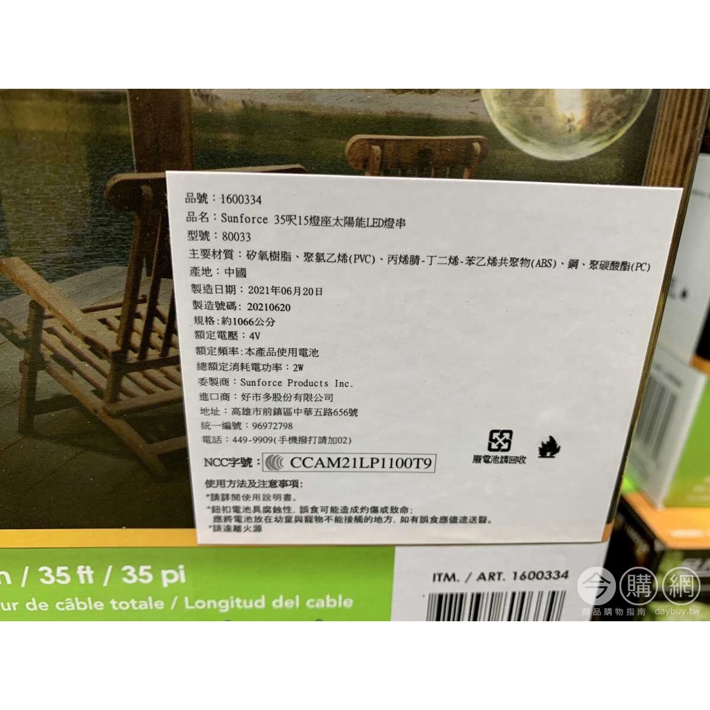 COSTCO好市多SUNFORCE 35呎15燈座太陽能LED燈串 #1600334