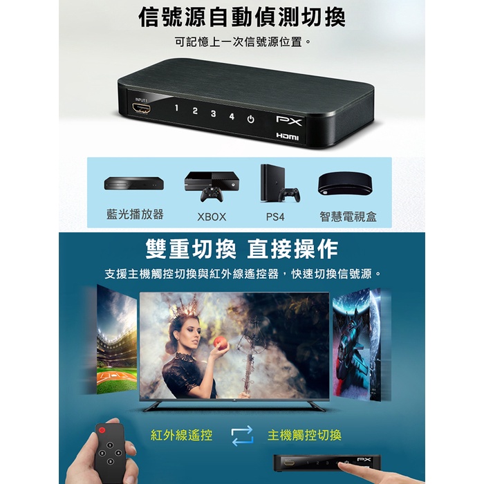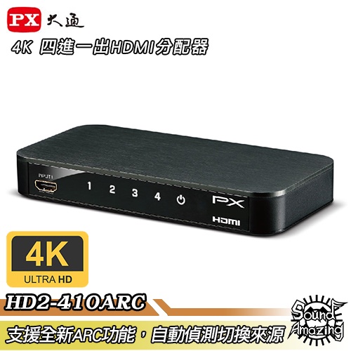 PX大通 HD2-410ARC 4進1出HDMI切換器 4K高解析/自動記憶/偵測訊號源【Sound Amazing】