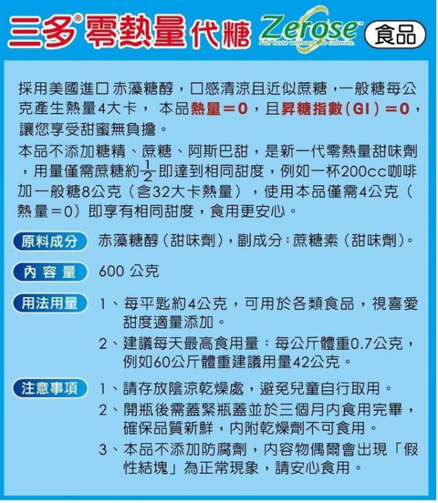 【三多零熱量代糖(600g/罐)(罐裝)】 產地美國