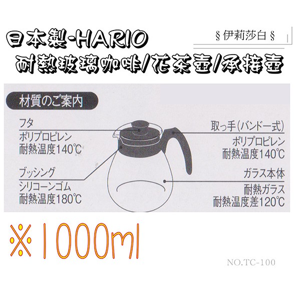 【日本製HARIO】TCR-100B1000ml玻璃壺/咖啡壺/花茶壺/耐熱壺/大容量/冷熱兩用玻璃壺/寬口玻璃壺
