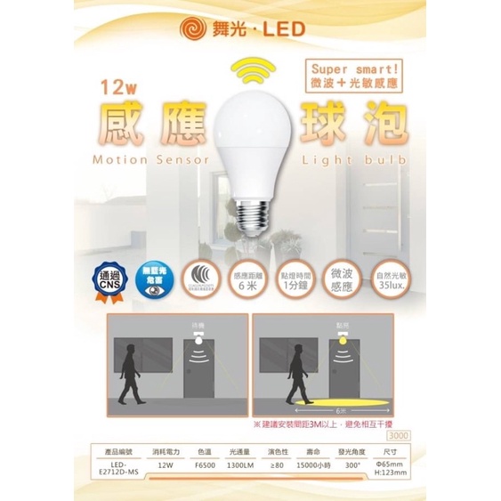 舞光 LED 12W 全日型 微波燈泡 微波感應燈泡 球泡 全電壓 E27 自動亮燈 感應燈