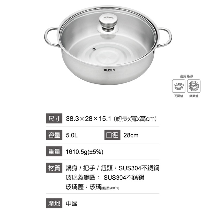 【THERMOS膳魔師】不鏽鋼含玻璃上蓋雙耳湯鍋火鍋28cm(KOS-W28H)