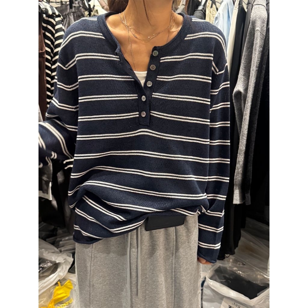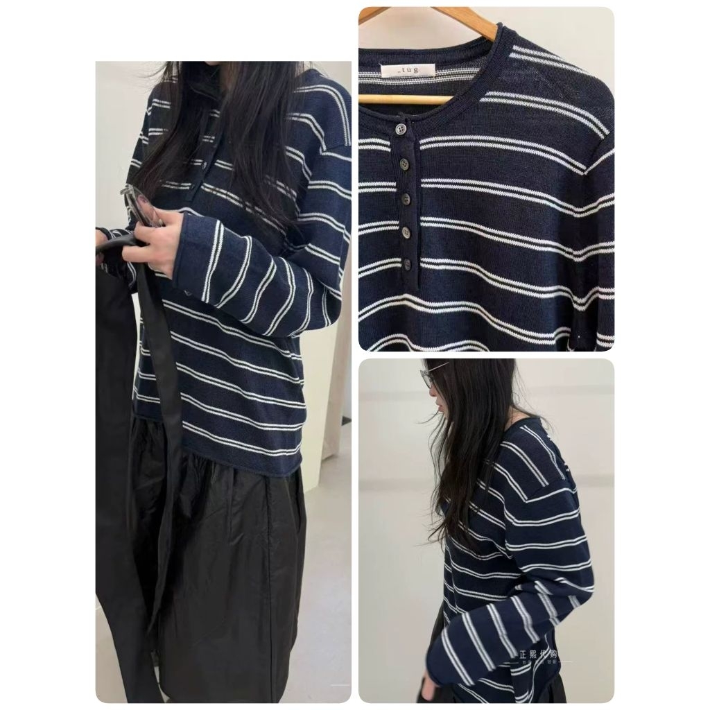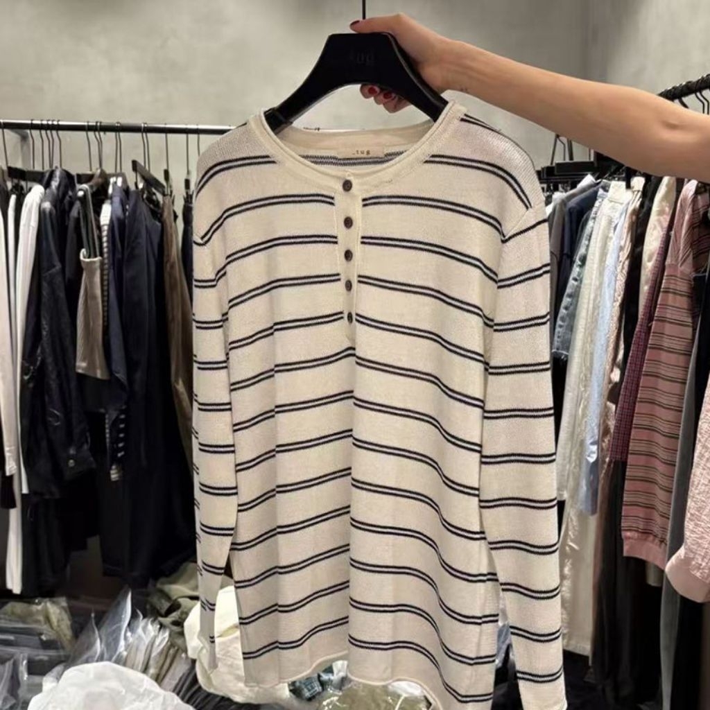 【JOLAN L’essentiel-風格選物】韓國 Tug早秋新品 |亨利領+排釦設計條紋上衣|寬鬆舒適版型