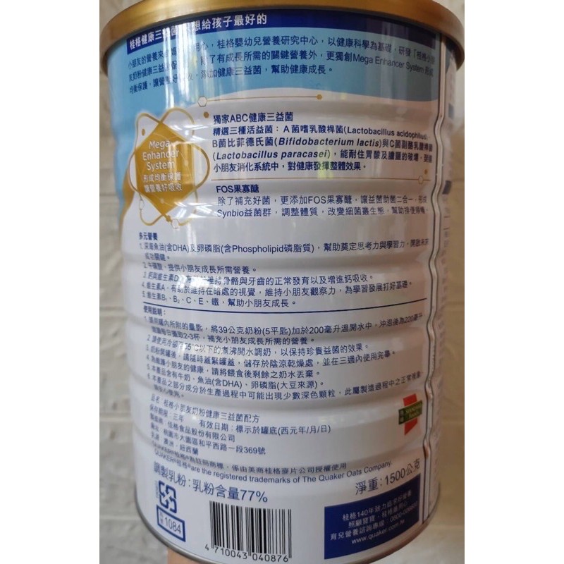 桂格三益菌小朋友奶粉1500g(4號3~10歲幼童適用)桂格奶粉 桂格4號