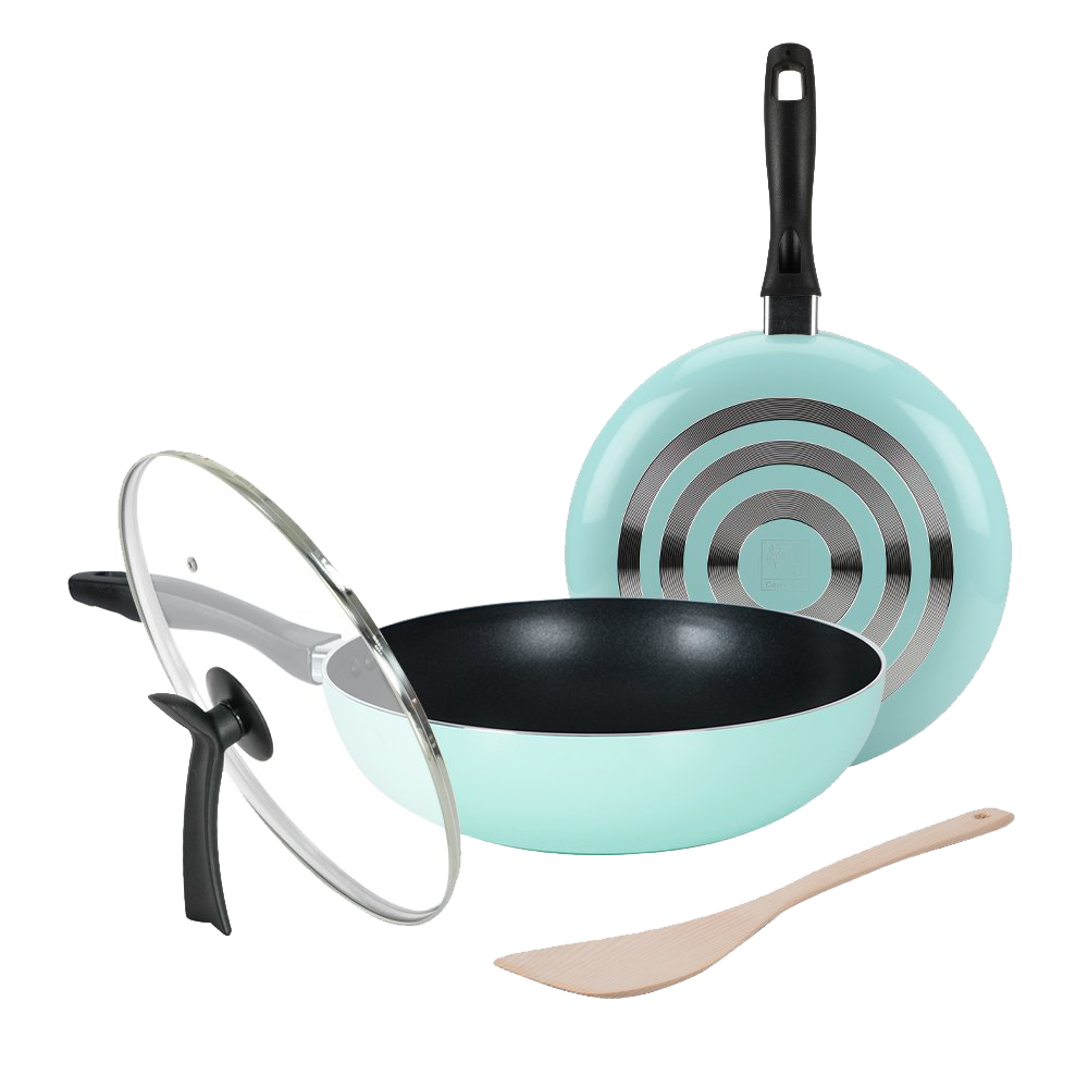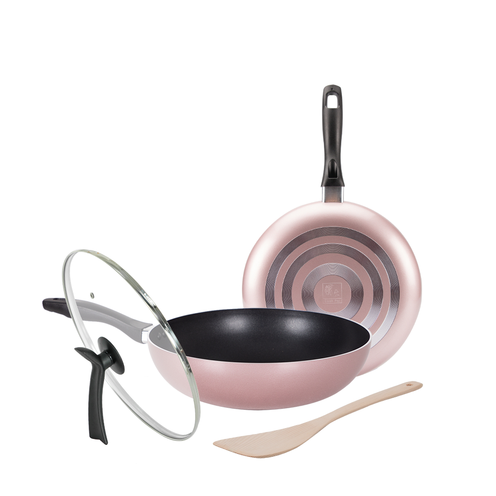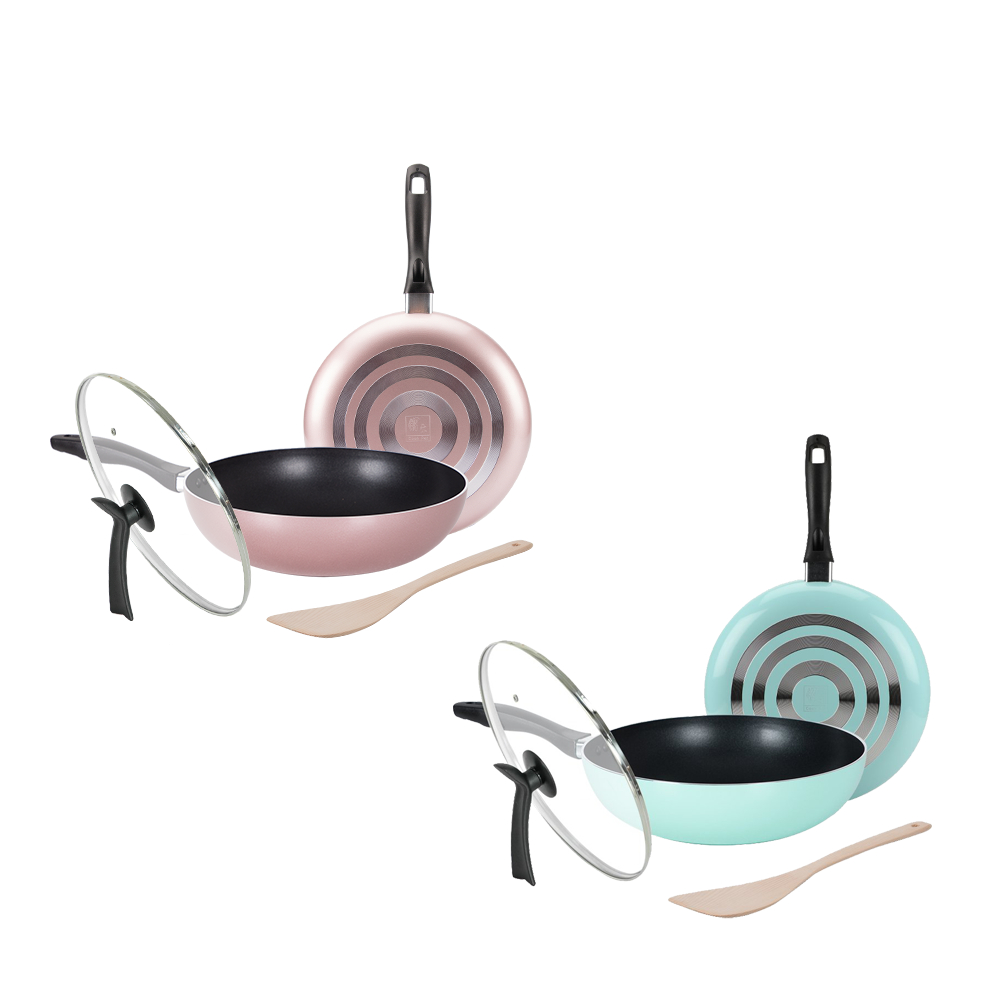 鍋寶 金鑽不沾雙鍋四件組(30cm炒鍋+30cm平底鍋+30cm玻璃鍋蓋+木鏟) 二色任選