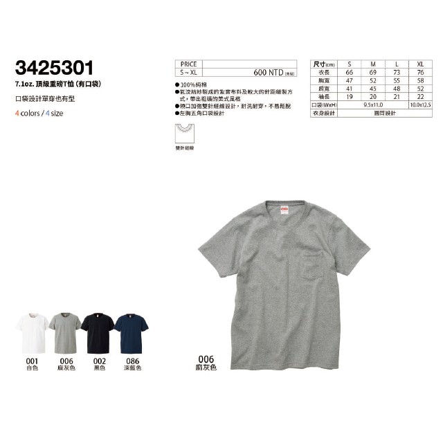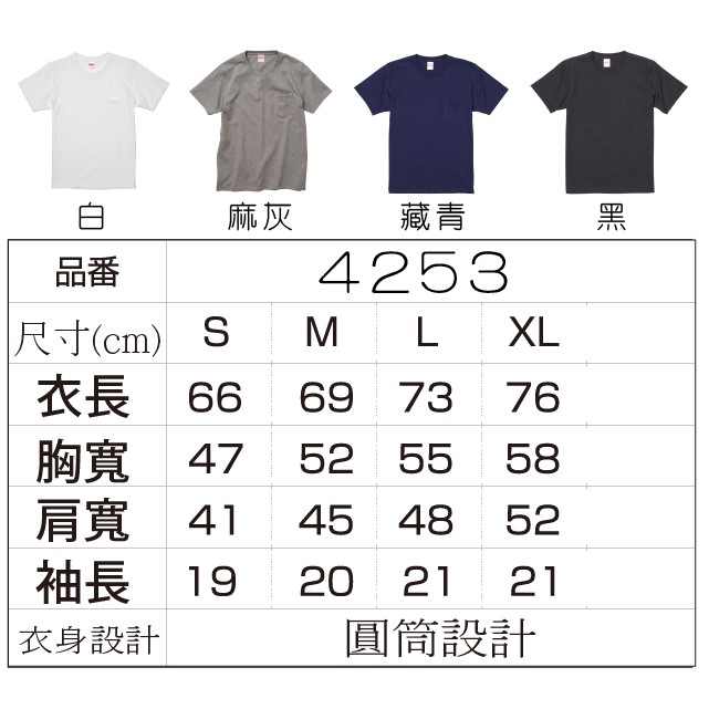 【日本】【UA】United Athle UA 4253 7.1oz重磅口袋T恤 素T T恤 34253