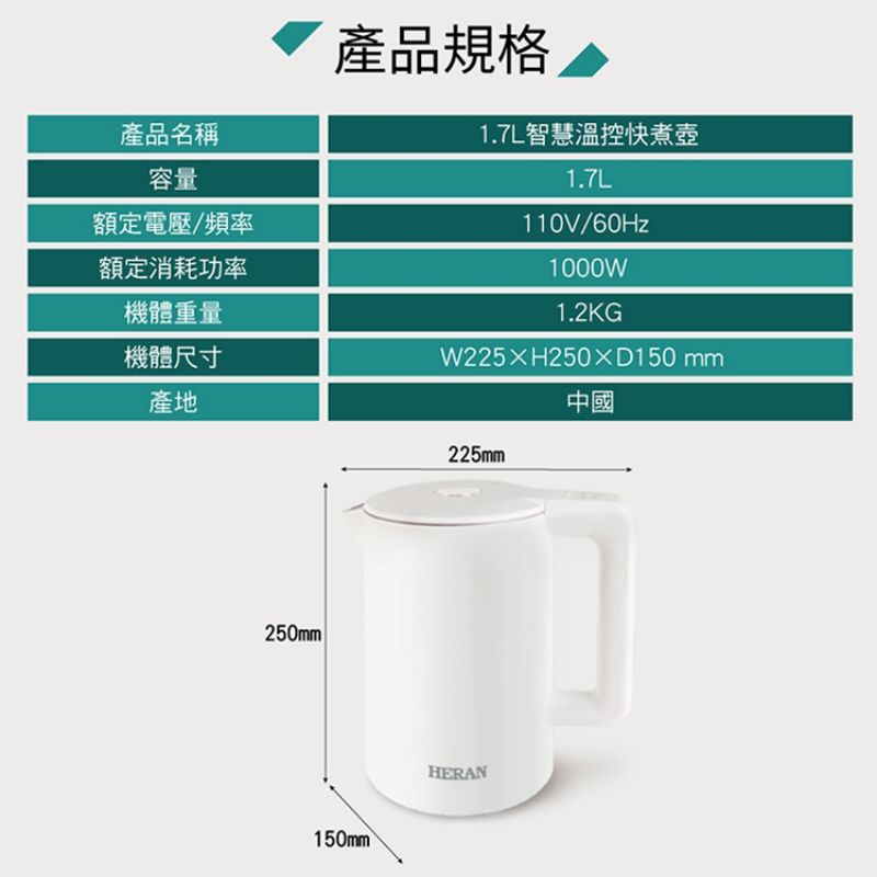 HERAN禾聯 1.7L智慧溫控雙層防燙快煮壺 智能不鏽鋼茶壺HEK-17GL010 泡奶神器 快煮壺
