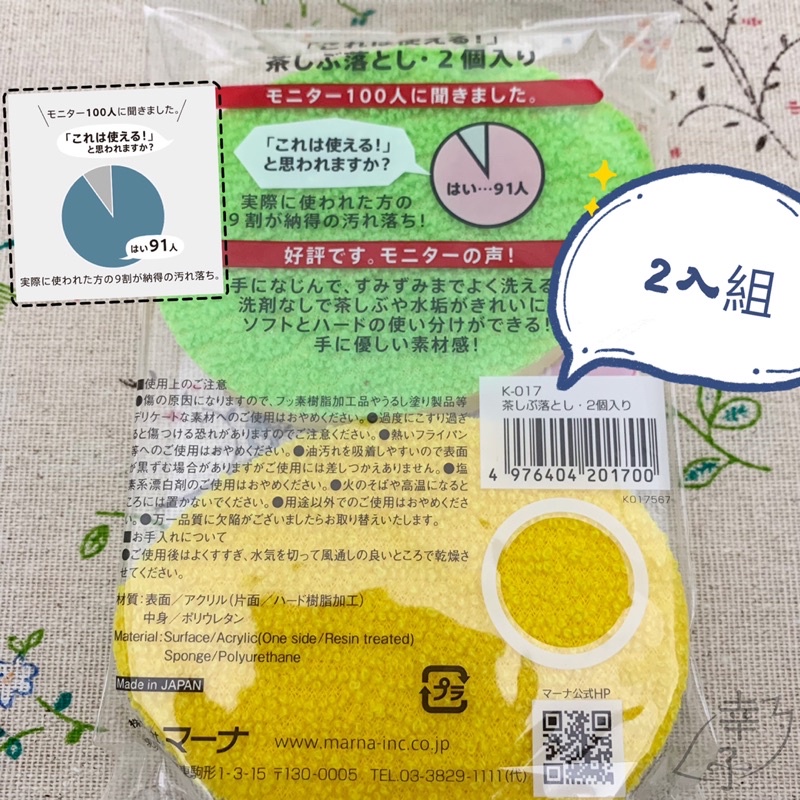 【幸運鹿🌟】日本 marna 雙面菜瓜布(2入) 雙面海棉 海綿 茶杯海綿 廚房海綿 菜瓜布 K-017