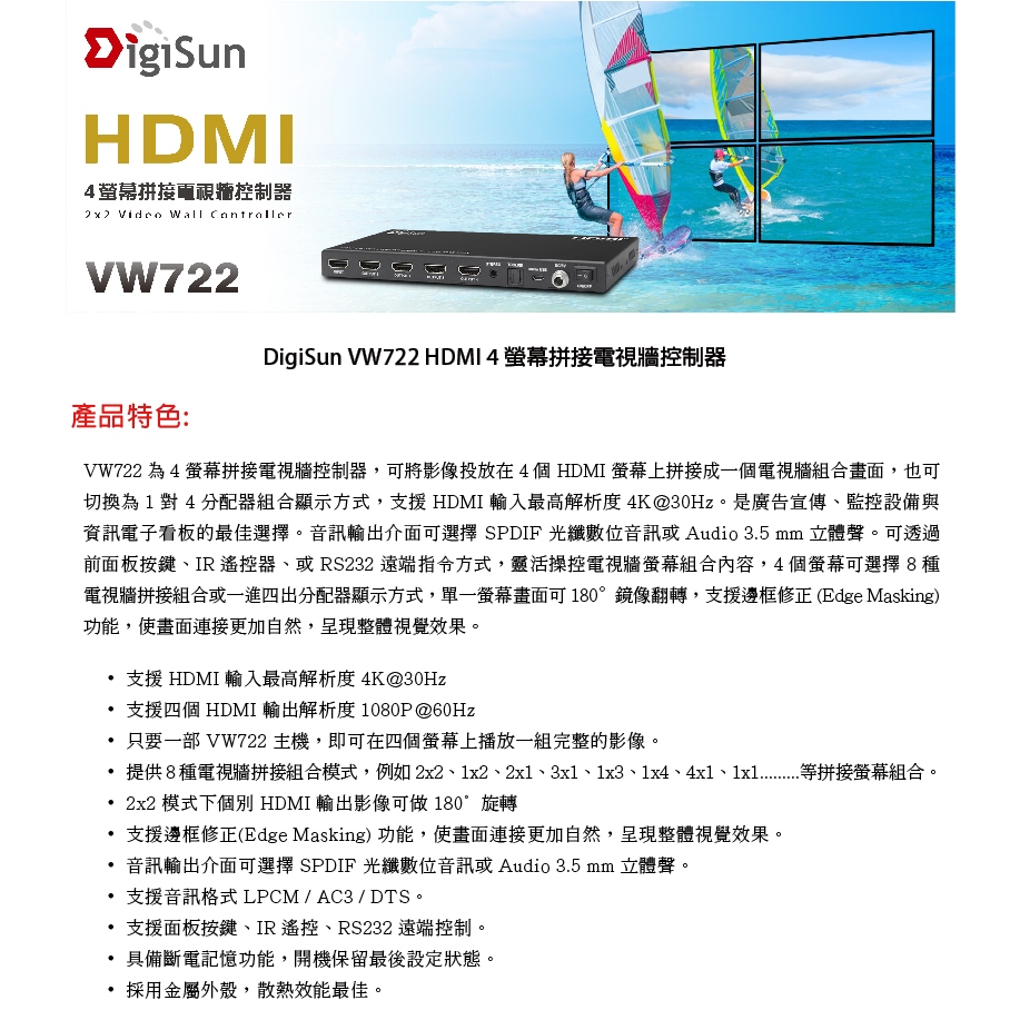 DigiSun VW722 4螢幕HDMI拼接電視牆控制器