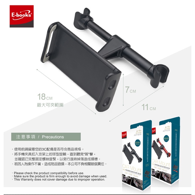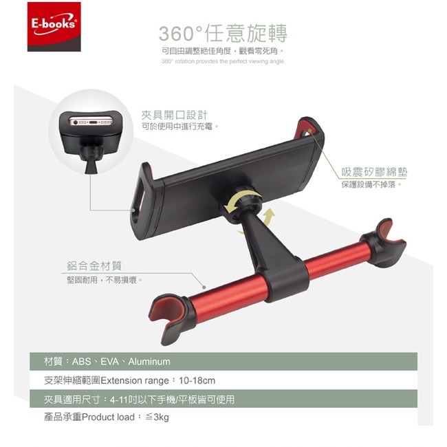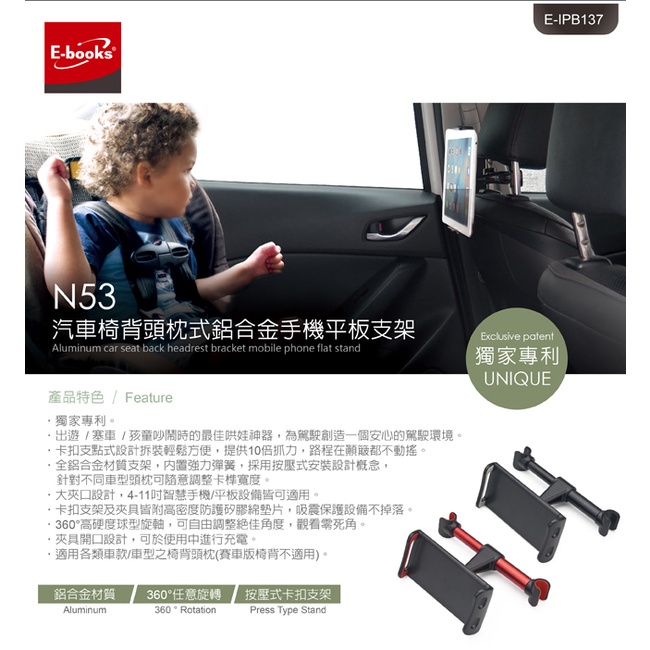 E-books N53 汽車椅背鋁合金頭枕式手機平板支架-紅/4-11吋
