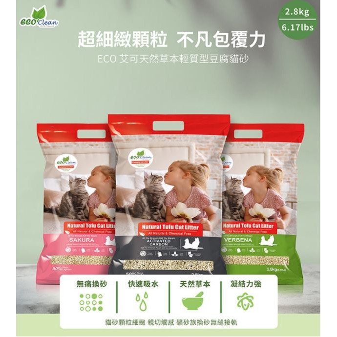 ECO CLEAN 艾可 環保豆腐砂 天然草本輕質豆腐貓砂 仿礦砂顆粒 櫻花/馬鞭草/活性碳 2.8kg