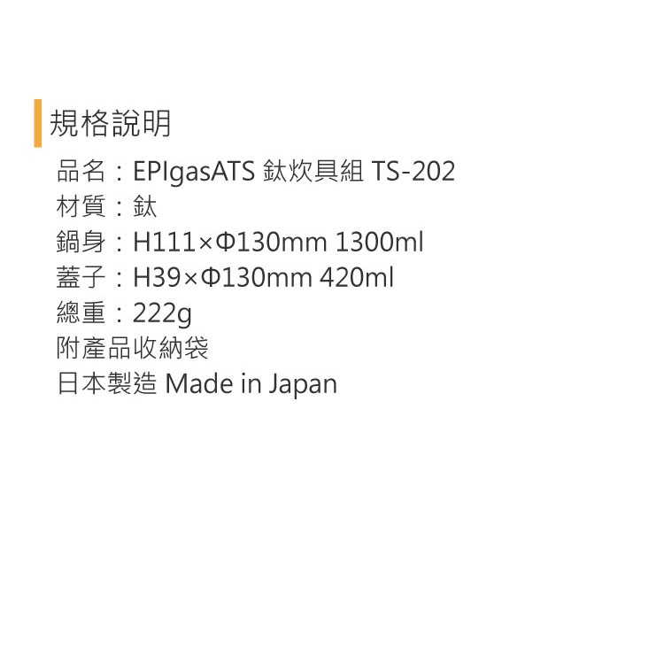 EPIgas ATS 鈦炊具組 TS-202【1鍋1蓋】 / 鈦鍋 登山鍋具 輕量鍋具 純鈦 城市綠洲