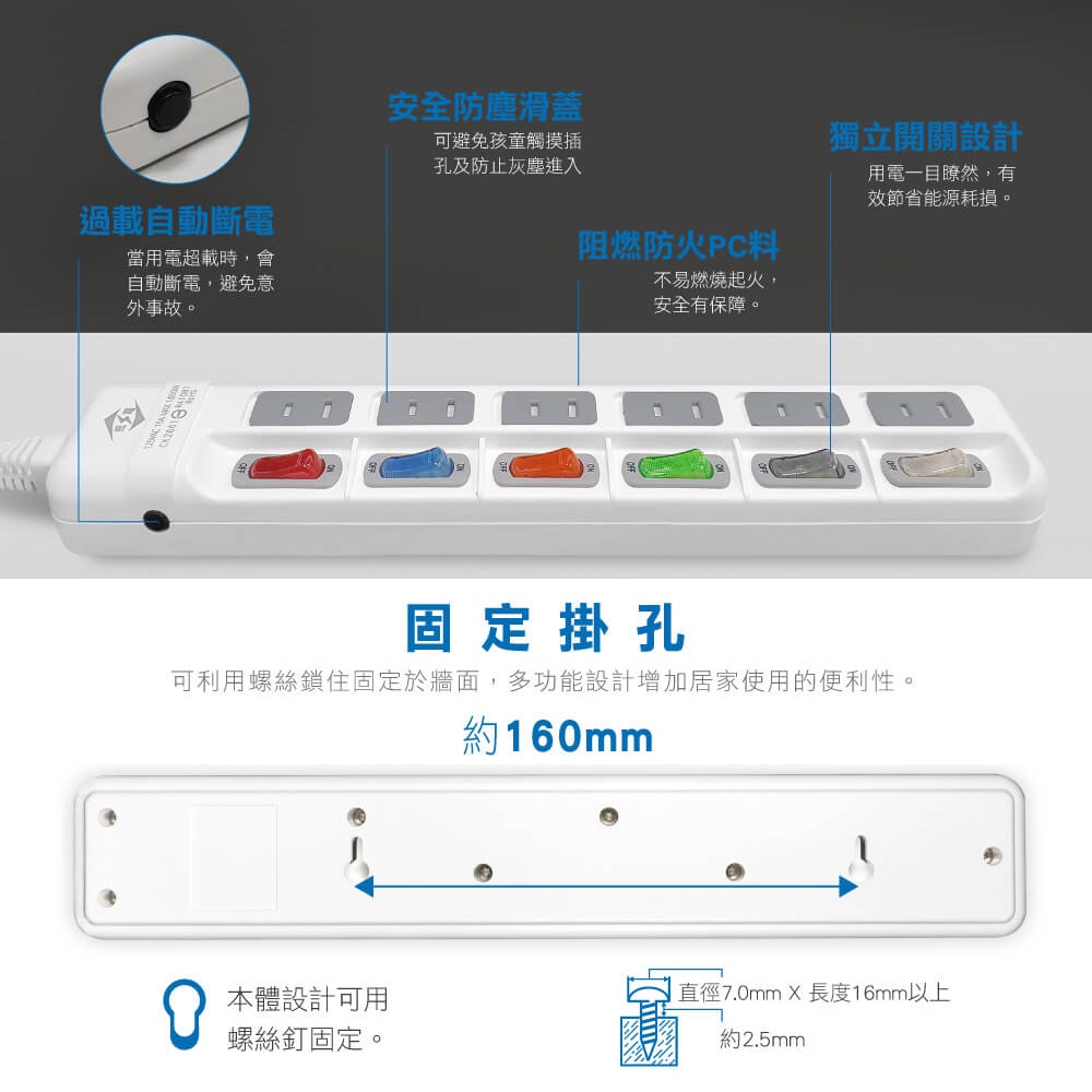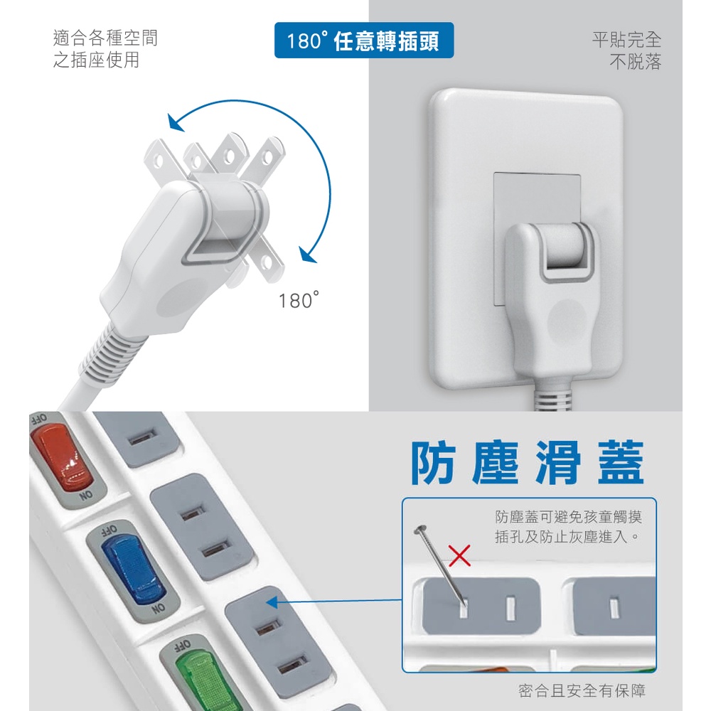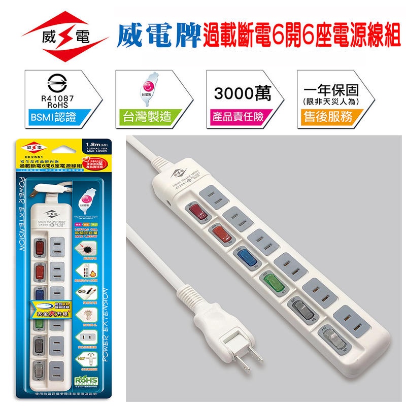 台灣製 CK2661 威電 2P 電源延長線 6開關 6插座 防塵滑蓋 180度可轉向插頭 防火材質 過載斷電 線長自選