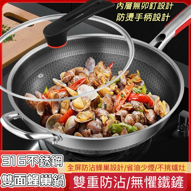 🌀LeLe生活百貨🌀32cm 316不銹鋼 蜂巢物理不沾鍋 贈玻璃鍋蓋 炒鍋 無塗層 物理不沾 不沾鍋 炒菜鍋