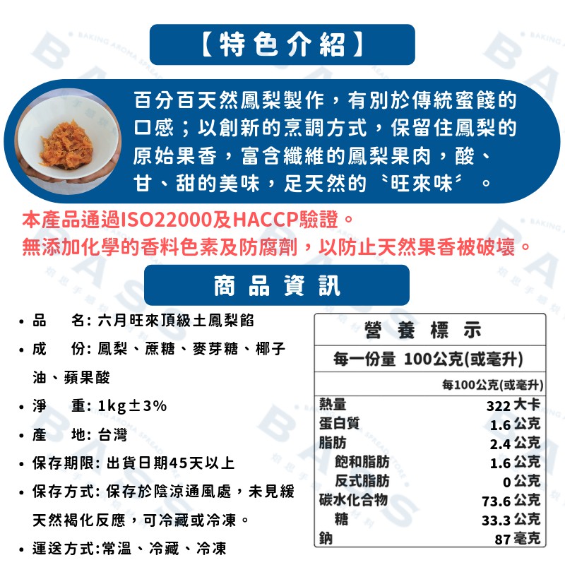 【焙思烘焙材料】 六月旺來 頂級 土鳳梨餡 1公斤真空裝 南投產銷班 台農2號 土鳳梨 濃郁香氣 無添加