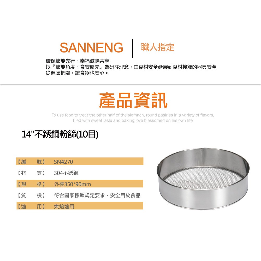 【SANNENG 三能】14吋不銹鋼麵粉篩 過篩網 網篩-10目 SN4270