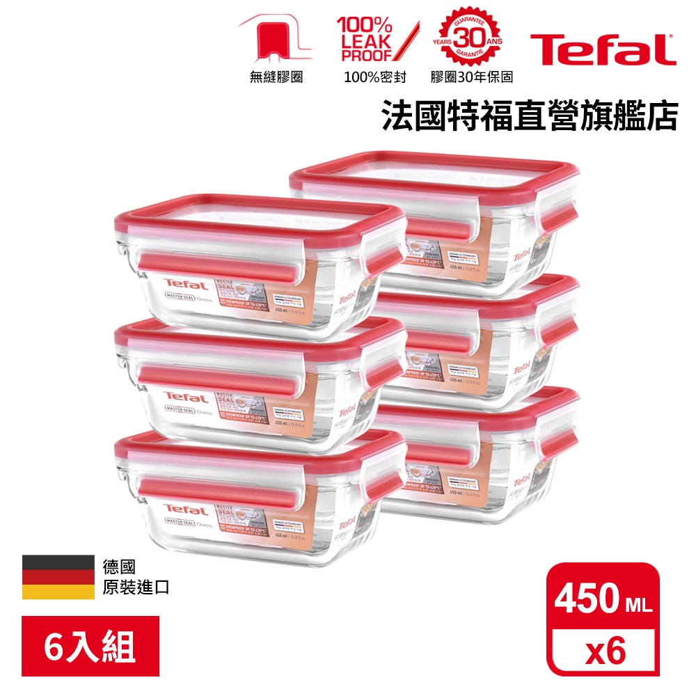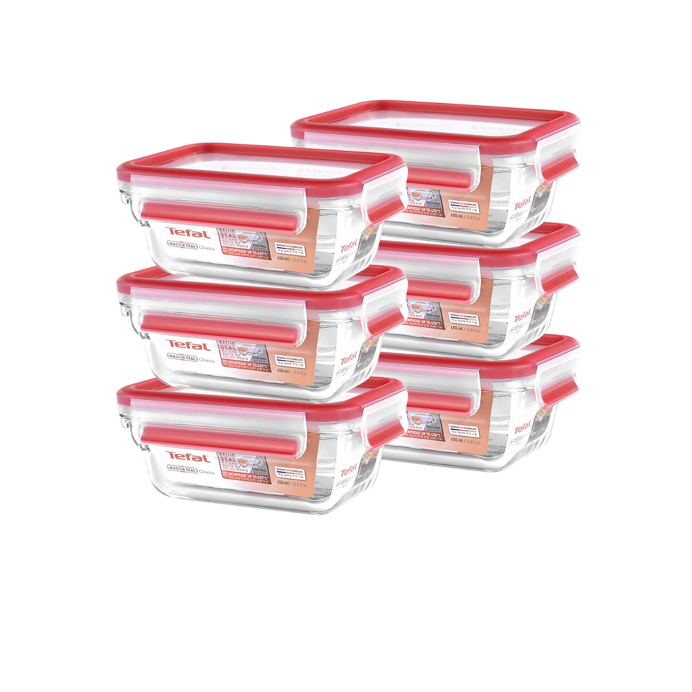 Tefal 法國特福 無縫膠圈 耐熱強化玻璃保鮮盒 0.45L(6入組) 微波/蒸煮/烤箱適用 便當盒/密封罐