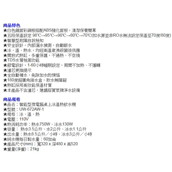 全台可標準安裝 賀眾牌 微電腦冰溫熱桌上型飲水機 (無過濾器) UW-672AW-1 (產品效率分級:第4級)