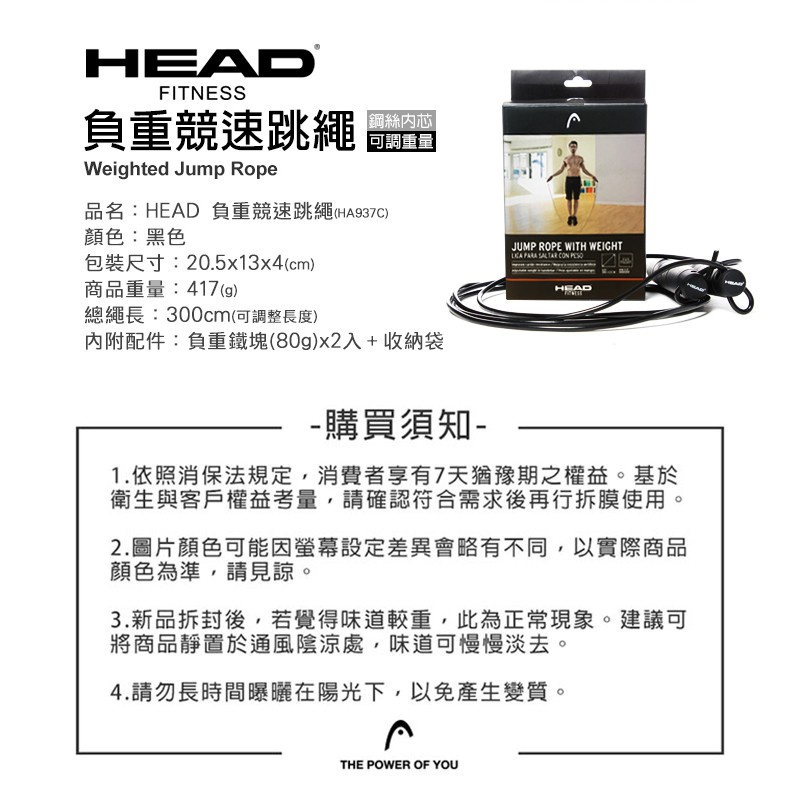 HEAD海德 負重競速跳繩 300公分繩長可調式 加重訓練 健身跳繩 心肺耐力肌力 體適能 不打結跳繩 快速爆汗減肥瘦身
