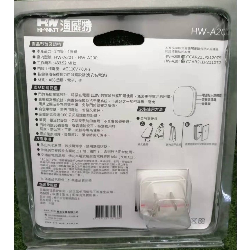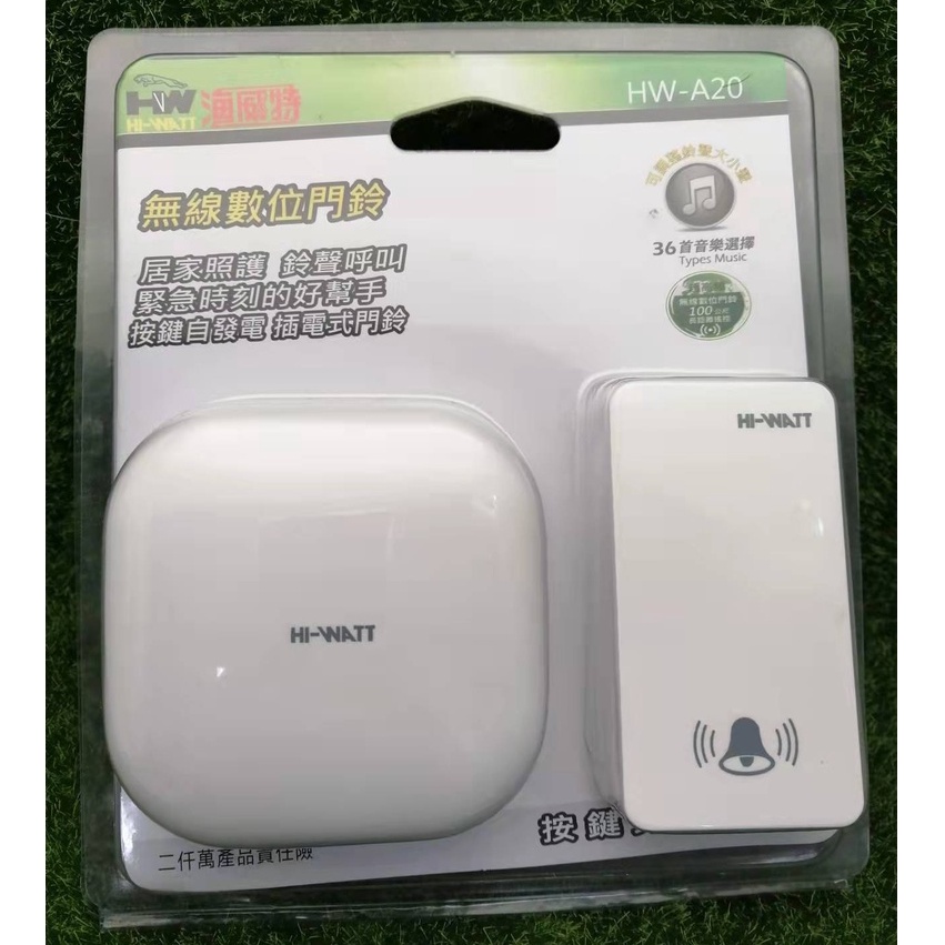 HI-WATT 海威特 無線數位門鈴 HW-A20 按鍵自發電 免電池 無線門鈴 看護鈴