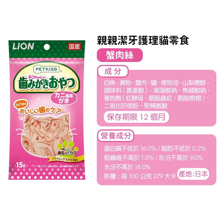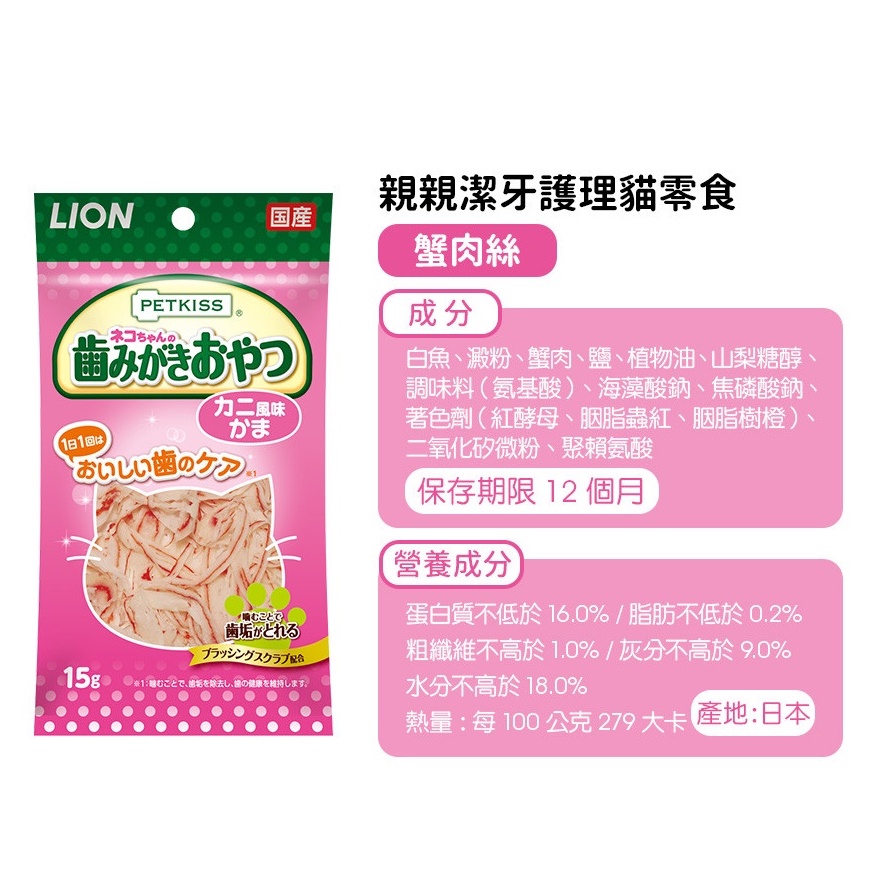 LION 獅王|小魚乾 獅王蟹肉絲 親親潔牙護理貓零食 貓用口腔護理零食 潔牙零食 潔牙 貓零食