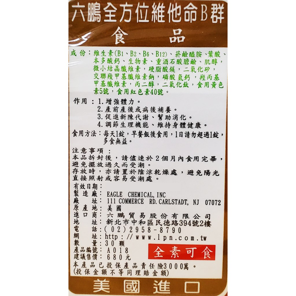 🔥10倍蝦幣回饋 最高優惠=9折🔥美國進口 六鵬 全方位維他命B群 膜衣錠 30錠 全素