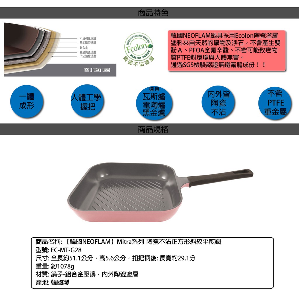 【EC購】【韓國NEOFLAM】Mitra系列- 28cm陶瓷不沾正方形斜紋平煎鍋-粉紅色