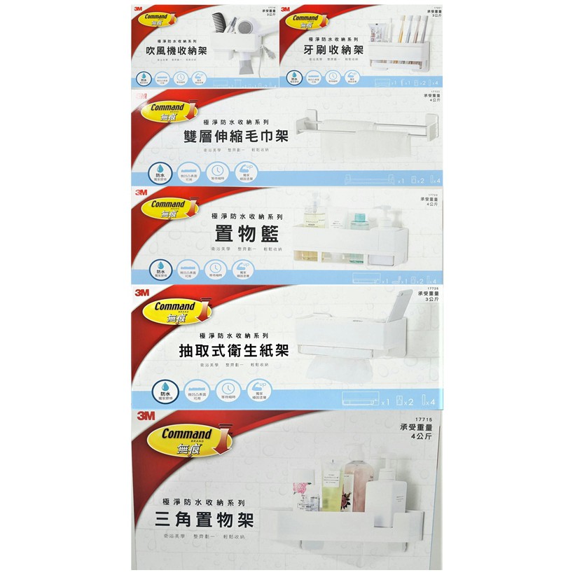 3M 無痕極淨防水收納 三角置物架.吹風機收納架.牙刷收納架.雙層伸縮毛巾架.置物籃.衛生紙架含稅附發票